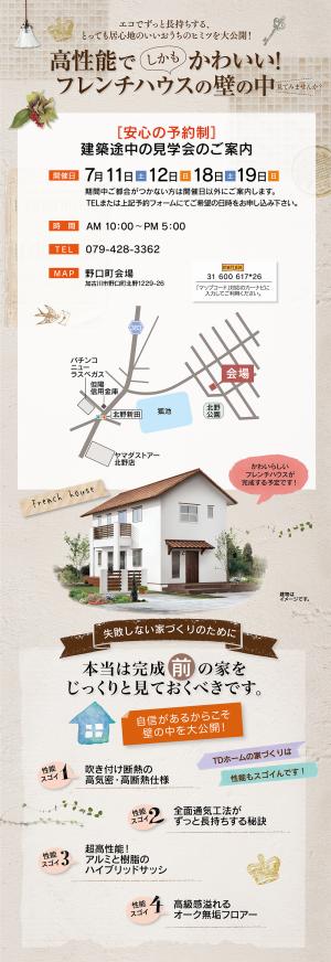 7/11.12.18.19の4日間、加古川市野口町北野で、高性能でしかもかわいい!フレンチハウスの[安心の予約制]建築途中の見学会を開催致します。吹付断熱の高気密・高断熱仕様に、全面通気工法、アルミと樹脂のハイブリッドサッシ、高級感あるオーク無垢フロアーなど、自信があるからこそ建築途中の家を大公開!安全に考慮して予約制にて開催しますので、ぜひご予約下さい♪