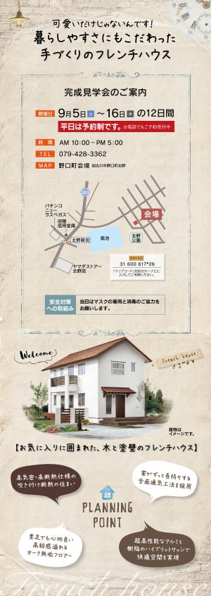 9/5〜16日の12日間、加古川市野口町北野で、高性能でしかもかわいい!フレンチハウスの完成見学会を開催致します。吹付断熱の高気密・高断熱仕様に、全面通気工法、アルミと樹脂のハイブリッドサッシ、高級感あるオーク無垢フロアーなど、これから家づくりをされる方必見!こだわりの住み心地をぜひご体感下さい♪