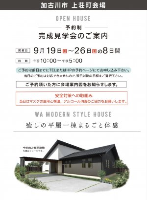 9/19〜26の8日間、加古川市上荘町で《予約制》完成見学会を開催致します。