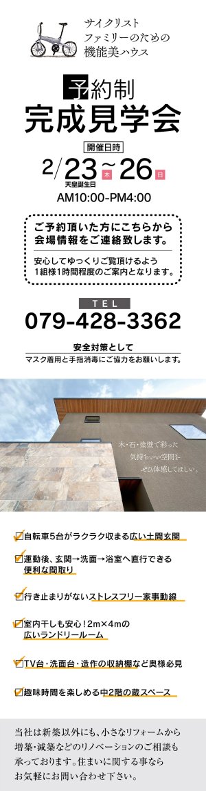 2/23(木・祝)〜26(日)、サイクリストファミリーのための機能美ハウスの予約制完成見学会を開催致します。