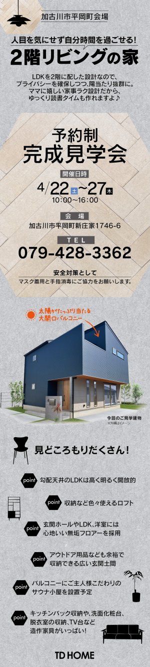 4/22(土)〜27(木)の期間中、加古川市平岡町で、2階リビングの家の予約制完成見学会を開催致します。