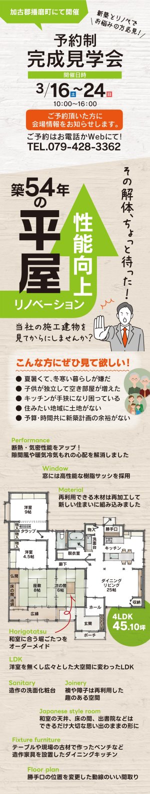 加古郡播磨町にてリノベーションした平屋の見学会を開催します。今回お披露目する建物は築54年のお住まいを快適に住めるよう高性能に、また家事ラク仕様に大変身させました。
